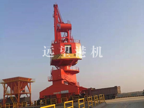 港口起重機,為港口裝卸散貨及件雜貨的全回轉門座起重機,用於碼頭前沿。適用於岸線較長的碼頭,如船廠的船台、舾裝碼頭(tóu)和萬噸級(jí)泊(bó)位散雜貨碼頭等。一般(bān)采用單臂架鋼絲繩變幅、單臂架齒條(tiáo)變幅或四連杆臂架齒條變幅結構(gòu)形式,配用吊鉤或抓(zhuā)鬥裝卸貨物。其(qí)結構(gòu)具有(yǒu)足夠的強度、剛度、穩定性和抗疲(pí)勞性。各機構布局合理,傳動平穩,操作(zuò)靈活,維修方(fāng)便,能適應吊鉤和抓鬥(dòu)的作業要求。在規定幅度範圍內,起吊額(é)定載(zǎi)荷可作水平變幅和360度回(huí)轉。起升、變幅、回轉、行走(zǒu)機構可單獨動(dòng)作,也可聯合動作。整機可沿(yán)水平鋪設的(de)軌道直線(xiàn)運行。該類產品(pǐn)具有工作幅度大(dà)、起升高度高、速度快、運轉平穩可(kě)靠、作業(yè)效率高等特點。